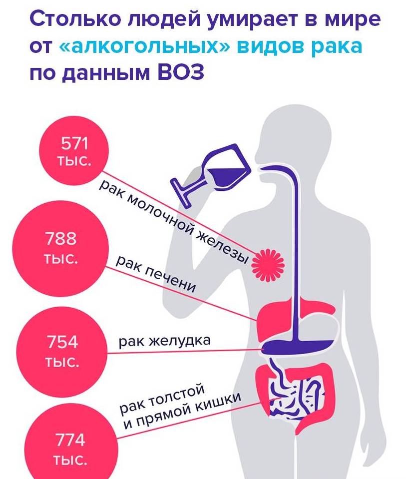 Рак полости рта, гортани, глотки, пищевода, молочных желез, толстой и прямой кишки, желчного пузыря и печени напрямую связан с употреблением алкоголя и дозозависим!
