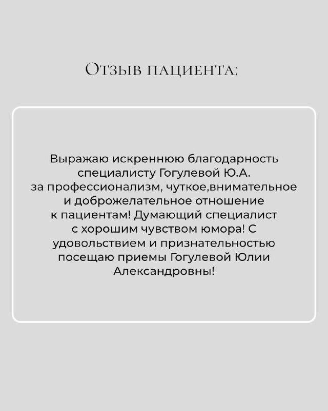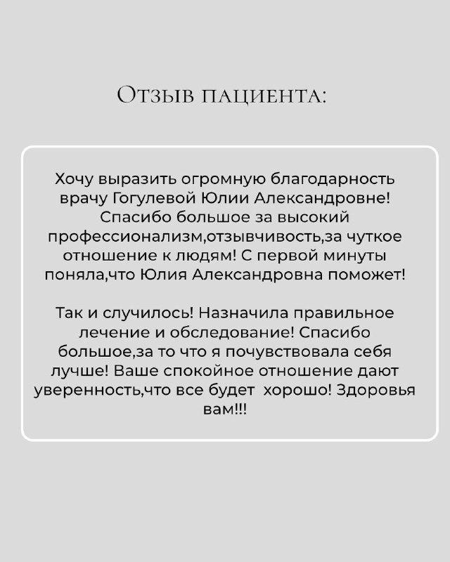 Пациенты, которые уже побывали на приёме, отмечают профессионализм, тактичность и внимательность Юлии Александровны.